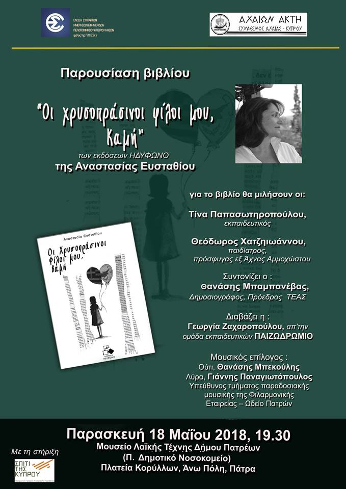 Το βιβλίο των εκδόσεων μας “Οι χρυσοπράσινοι φίλοι μου, Καμή” της Αναστασίας Ευσταθίου, θα παρουσιαστεί στο Μουσείο Λαϊκής Τέχνης Δήμου Πατρέων, στο Παλαιό Δημοτικό Νοσοκομείο στις 18 Μαΐου στις 19:30.