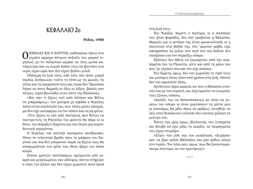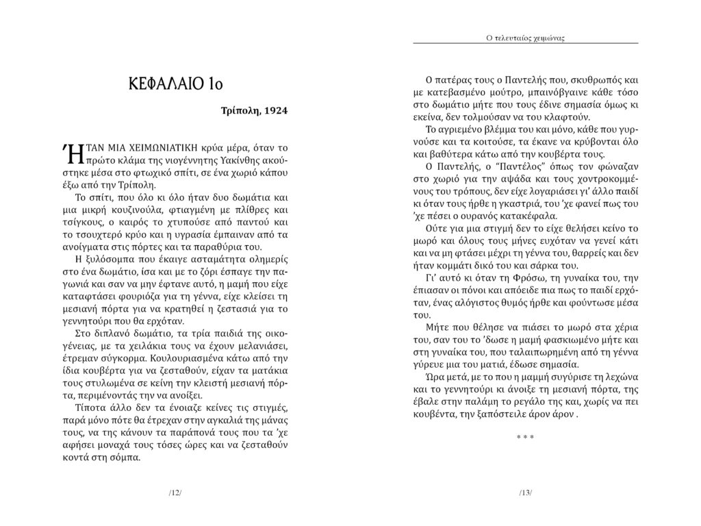 Ένα μυθιστόρημα, όπου οι ζωές των ανθρώπων υφαίνονται με σφιχτές βελονιές. Η Φρόσω ζώντας δίπλα στον “Παντέλο”, είχε πάψει να ελπίζει και η Θεωνίτσα που ξέμεινε να γεράσει μονάχη, πίστεψε πως, ως κι ο Θεός την είχε ξεχάσει. Ο Χαρίτος “θαλασσοπνίγηκε” λαχταρώντας το δικό του θαύμα και ο Ανδρέας, αρνήθηκε τον γιο του και χάραξε ξέχωρη από κείνον ζωή. Η Αρτεμούλα μαράζωσε που την πάντρεψαν αθέλητά της και ο Μενέλαος καταρρακώθηκε κι έχασε τον κόσμο, σαν έμαθε την ατιμία της γυναίκας του. Ο Κωστής που πάντα αποζητούσε την αγάπη, δεν είχε να δώσει άλλο πέρα από προδοσία και πόνο κι ο Αποστόλης που έκανε την πίκρα του οργή, γύρεψε την παρηγοριά στο καπηλειό. Από κοντά τους και η Χρυσούλα, ο Νικόλας, η Πολυξένη, η Χαρούλα, ο Μήλιος, η Αγνή… Όλοι βαριόμοιροι, αδύναμοι να αντιπαλέψουν τη μοίρα τους, αφέθηκαν και είδαν τις ζωές τους να πηγαίνουν στράφι. Κι αν δρόμοι τους έσμιξαν, μοιράστηκαν το διάβα τους και πάσχισαν αντάμα, τίποτα δεν τους βγήκε σε καλό. Και μόνο η Υακίνθη που ακόμη και στις “βαρυχειμωνιές” της βαστούσε το κουράγιο της, ήλπιζε πως κάθε χειμώνας θα ήταν και ο τελευταίος.