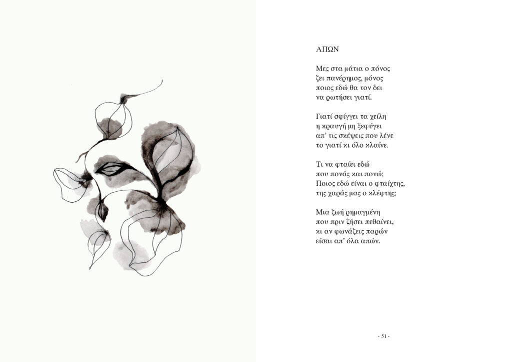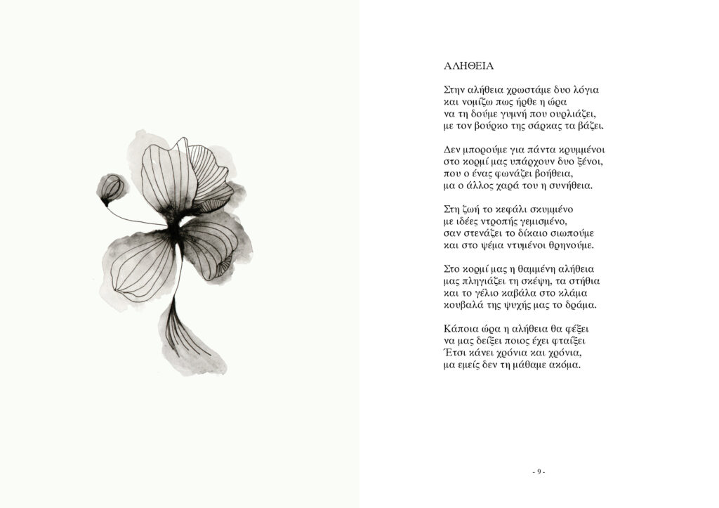 Η ποιητική συλλογή περιλαμβάνει ποιήματα που στοχεύουν να αγγίξουν τα βαθιά θέματα της αγάπης, της εγκατάλειψης, της εξάρτησης, της θλίψης και της απώλειας. Τα ποιήματα συνοδεύουν εικαστικές δημιουργίες της ίδιας της συγγραφέως.